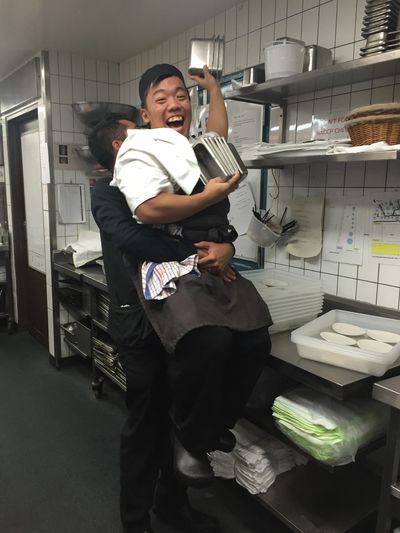 Windey’s in a flap. Turner’s only plating up four dishes for roughly thirty of us. He’s in a foul mood, which is usual around menu changes. Now is not the time to lodge my complaint over the recent quality of staff meals. He was venting to Szeeto and I, adding that he’d just texted Luffy. With that, Josh enters the room. The two of them stand up the back of Section Three while I try not to listen to their conversation.