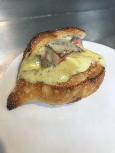 (Cat) ‘It’s kingfish ceviche with bread croutons, a tomato basil foam and olive dust. It’s dairy-free and Kazu says it can be modified for pregnant women without the kingfish, and made gelatine-free without the croutons.’