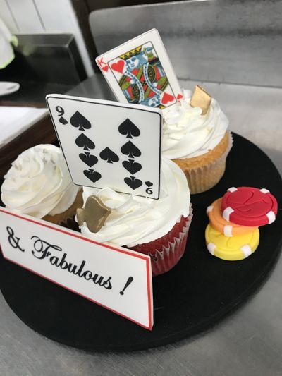 Just when I was getting used to the level of pretension, desserts (not supplied by our pastry team) were served. They consisted of an array of cream-topped cupcakes sporting edible fondant playing cards and marzipan gambling chips inscribed with ‘K’ for Kenny. The theme was adult but the execution is Woman’s Weekly Children’s Birthday Cakes.
