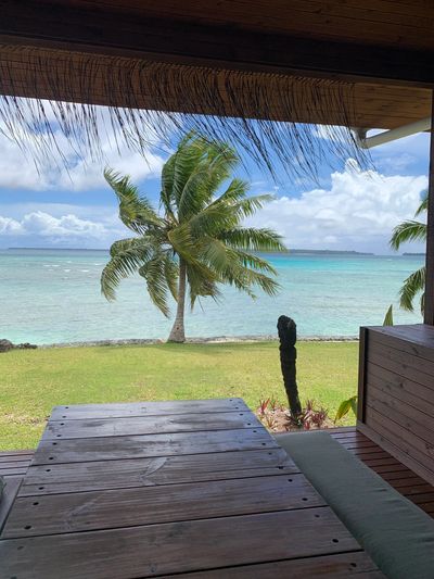 Two locals skipper us to our destination, a stretch of beach on the Eastern side of Aore Island. We jump into the turquoise water, pulling the boat up into the shallows. Naomi the housekeeper and her two young boys, Thomas and Leo, meet us along with a couple of welcome-party dogs. They help carry our things along the beach to the house. This is the final 100m obstacle-course (coral, crabs, coconuts, low-growing trees) to scramble over, wearing inappropriate footwear and even more inappropriate (when wet) linen trousers. This completes today’s travel hexathlon (Golf buggy, taxi, Twin Otter, open-pantry challenge, water taxi, beach scramble) after which we finally earn our leis.