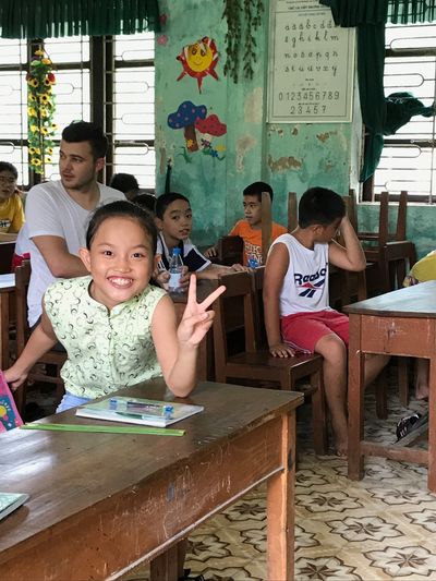 The two women direct everybody into the classroom where introductions are held. Classrooms are rudimentary concrete cubes with openings for windows and doors. There’s an open corridor running the length of the single-story building at the front; this provides shelter. A couple of wall-mounted fans provide climate-control. The furniture consists of old-school school-desks, the teacher stands on a raised platform before a chalk-board. Conditions are challenging for two white kids with hangovers.